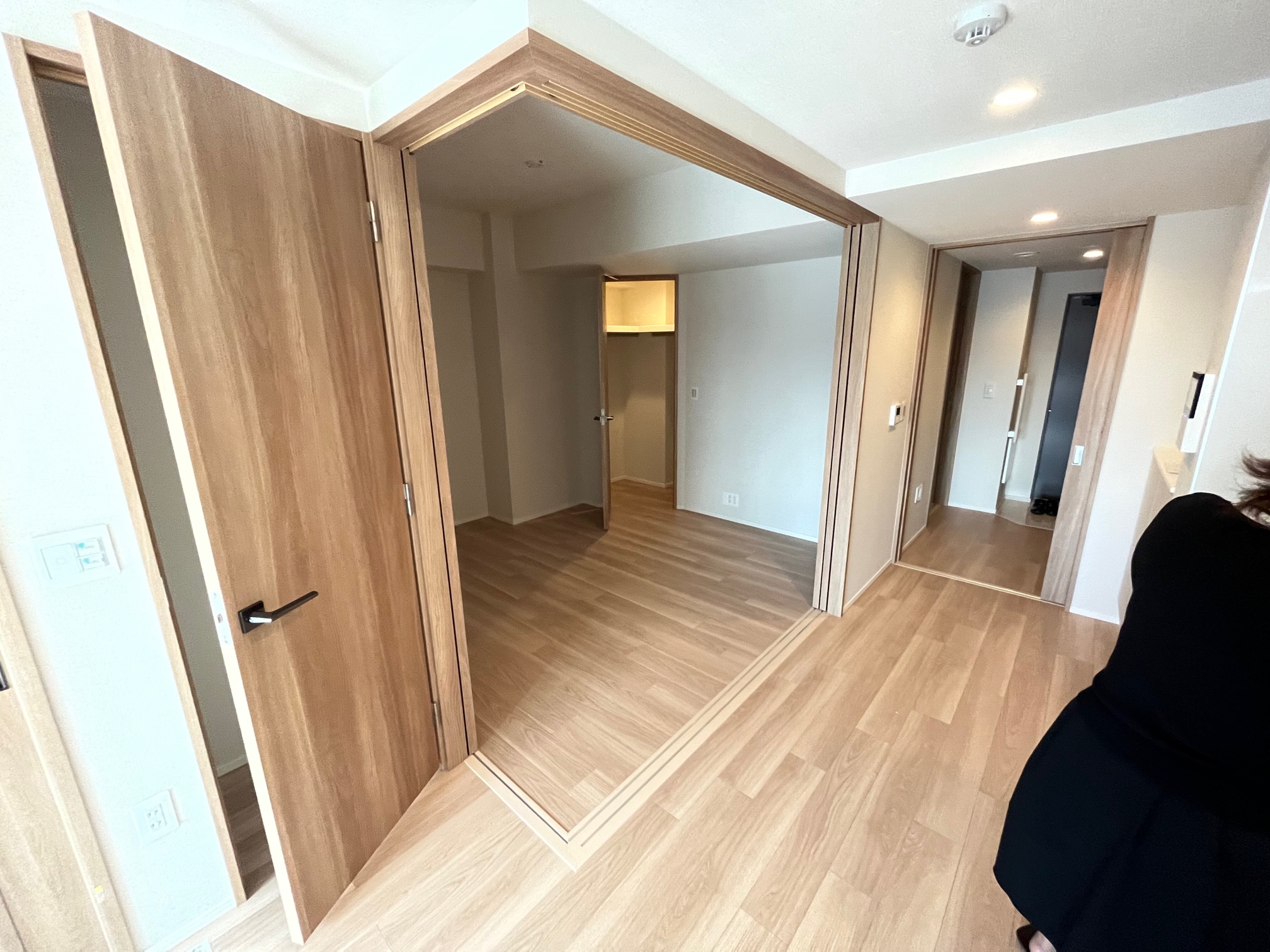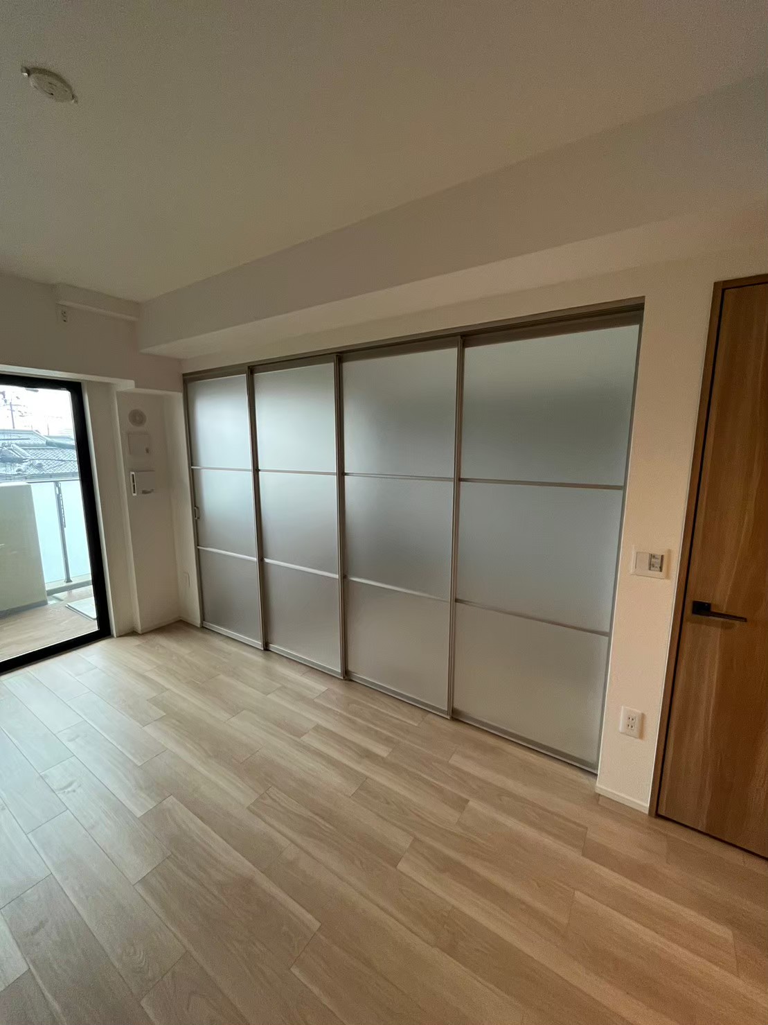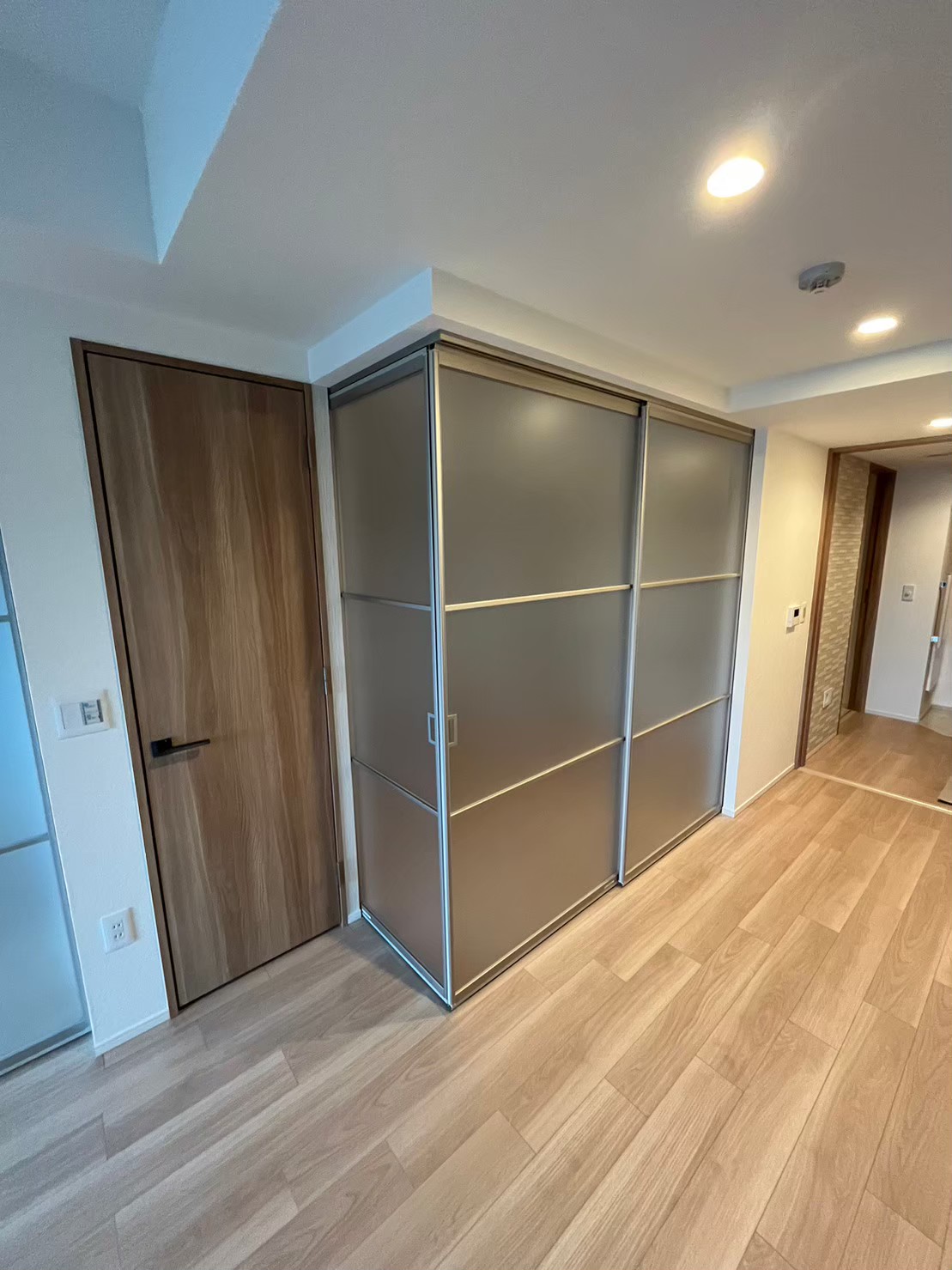 – **ポイント1**: 木目の建具を空間を広く見えるようにアクリル板の建具に変更
