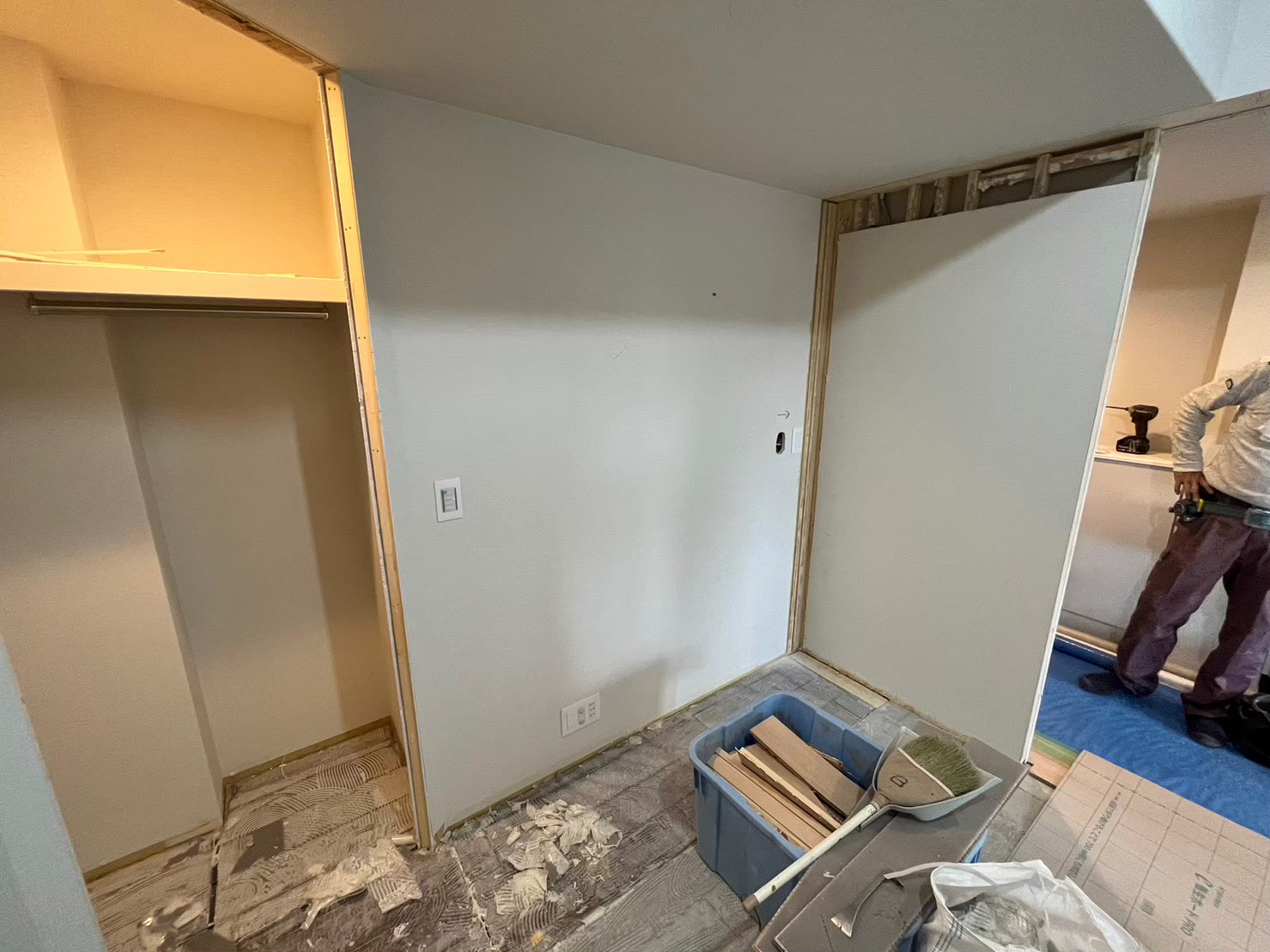 リフォーム箇所 / 建具・フローリング・壁・解体 壁補修 フローリング貼り 建具新調 可動収納 枕棚 ハンガーパイプ クロス張替 工事