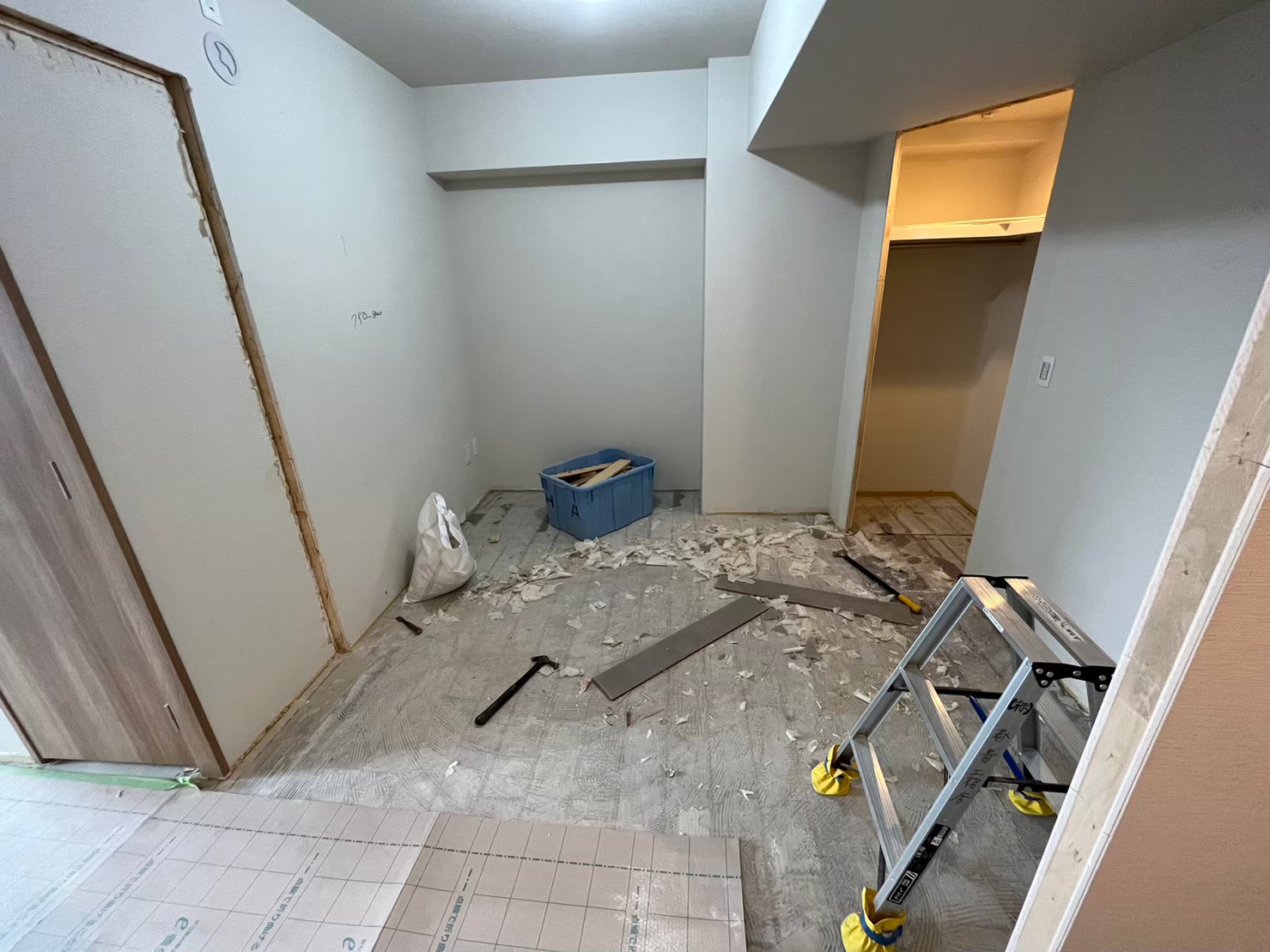 洋室・中洋室の建具を撤去して、収納の建具も撤去 フローリングも貼替が必要なのでフローングも撤去していきます。