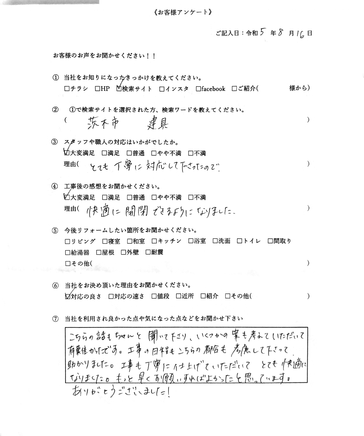 AUG 30 2023 お客様の声 建具の交換をさせていただきました 建具工事/茨木市/F様 トイレの扉の建具の交換をさせていただきました。 アウトセットにて、取付とクロスの張替です。 とれもうれしいお言葉いただき感謝してます。 工事完了写真 Post Share Hatena Pocket RSS feedly Pin it 投稿者: classcreateお客様の声コメント: 0 駐車場のブロックの補修をさせていた... 『大阪市戸建て 洗面台交換 洗面土...